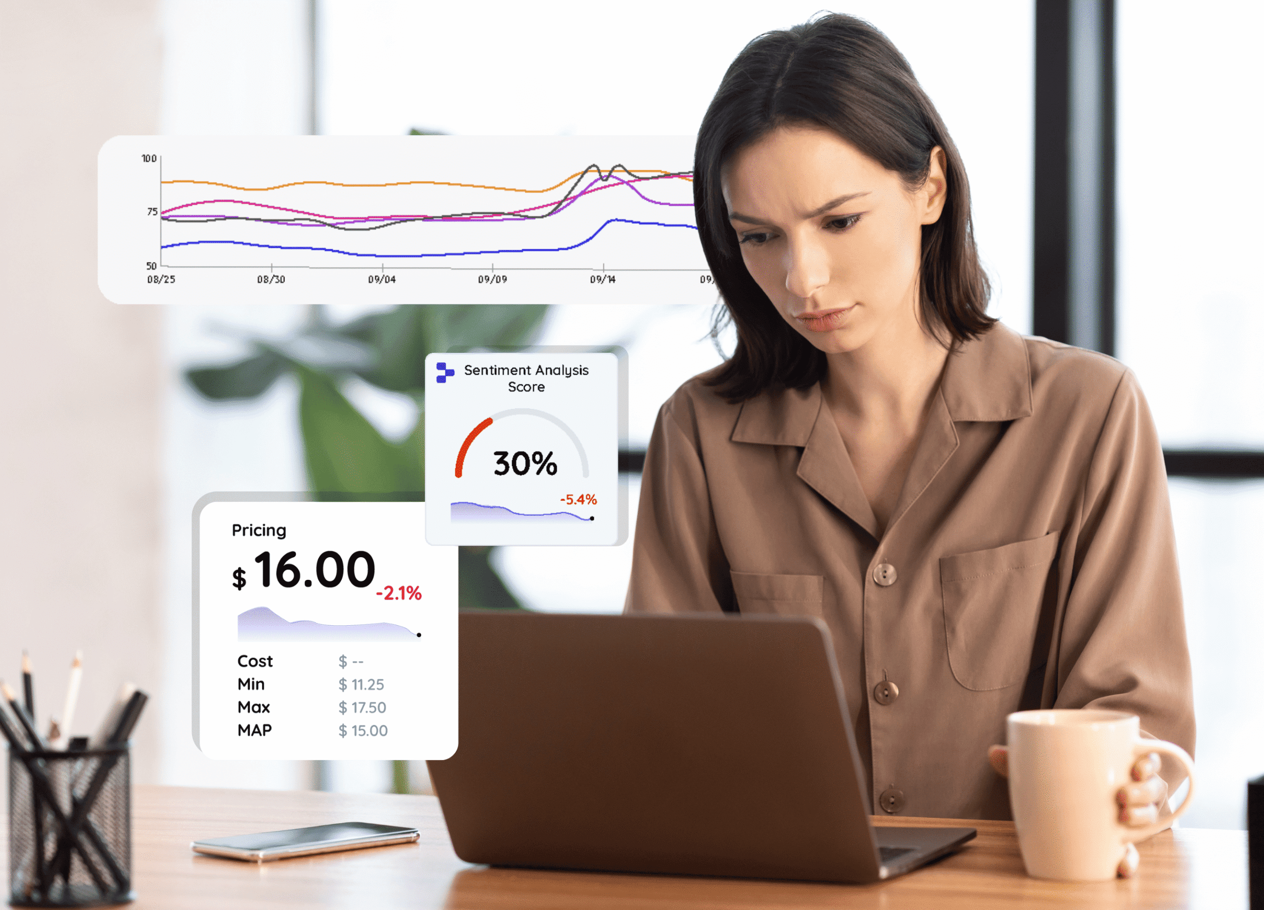 Measures competitor sentiment, share of voice, and product performance across retailers to benchmark your strategy and adapt quickly.